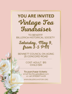 Each year in May, the Billerica Historical Society hosts a Vintage Tea, thanks to Diane Douglas and her volunteers. Up to 75 people, including children, and a few men attend this event. Vintage tea includes tea, sweets, and other treats:  Of course, Tea is served in China cups and tea pots make their appearance.